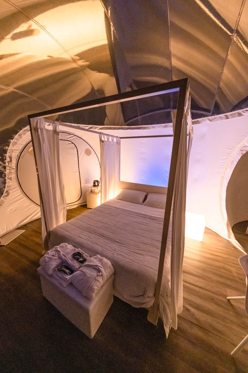 In this bubble, you can rest on a four-poster bed and relax under the starry sky. The theme of Mars is the color red; in fact, the plants, flowers, and outdoor lights are all red.